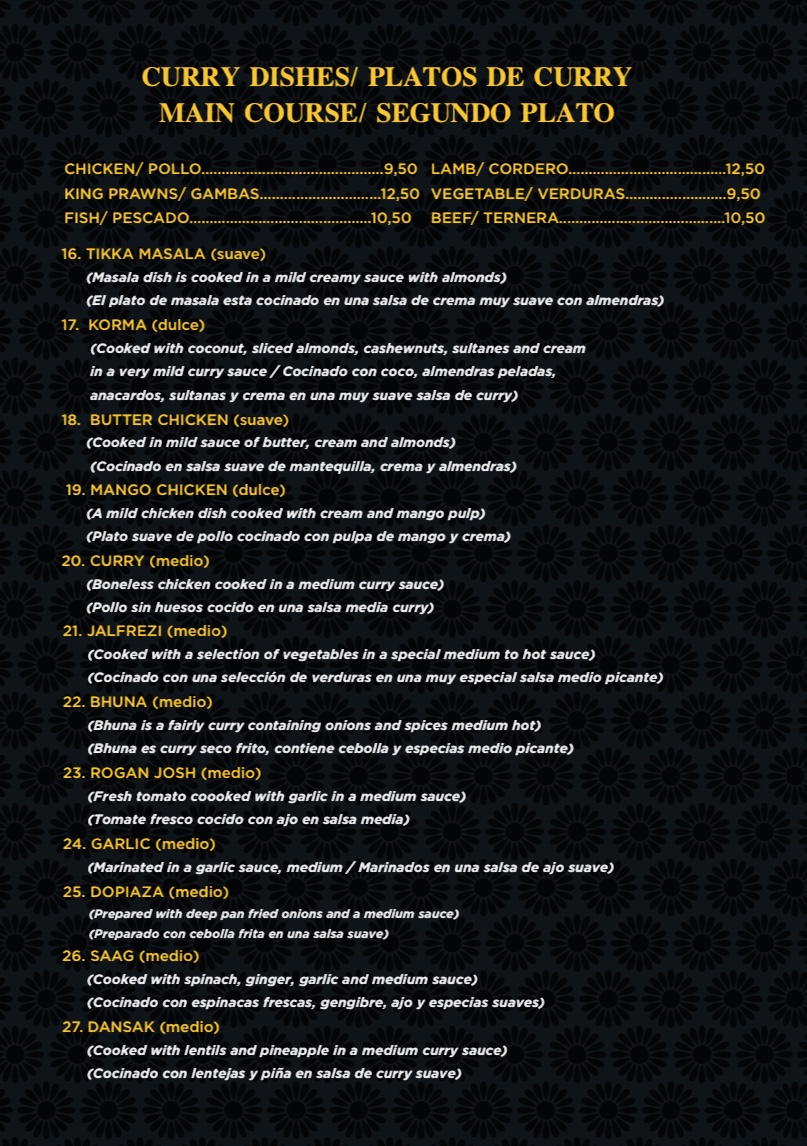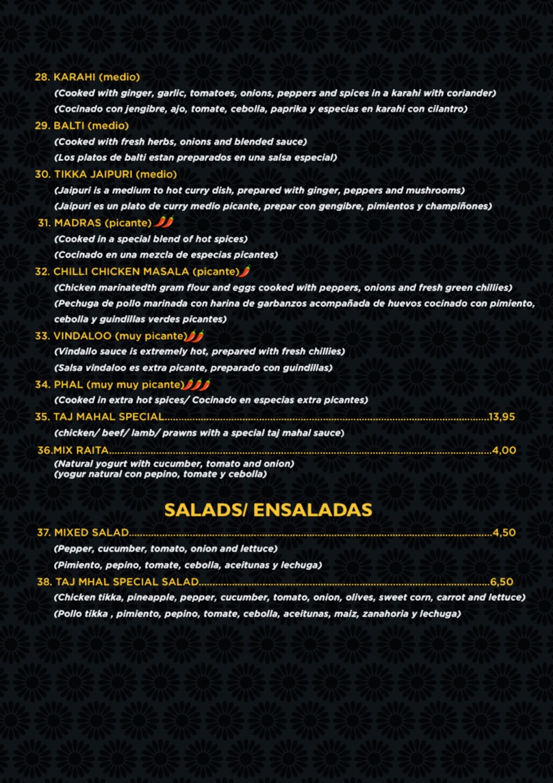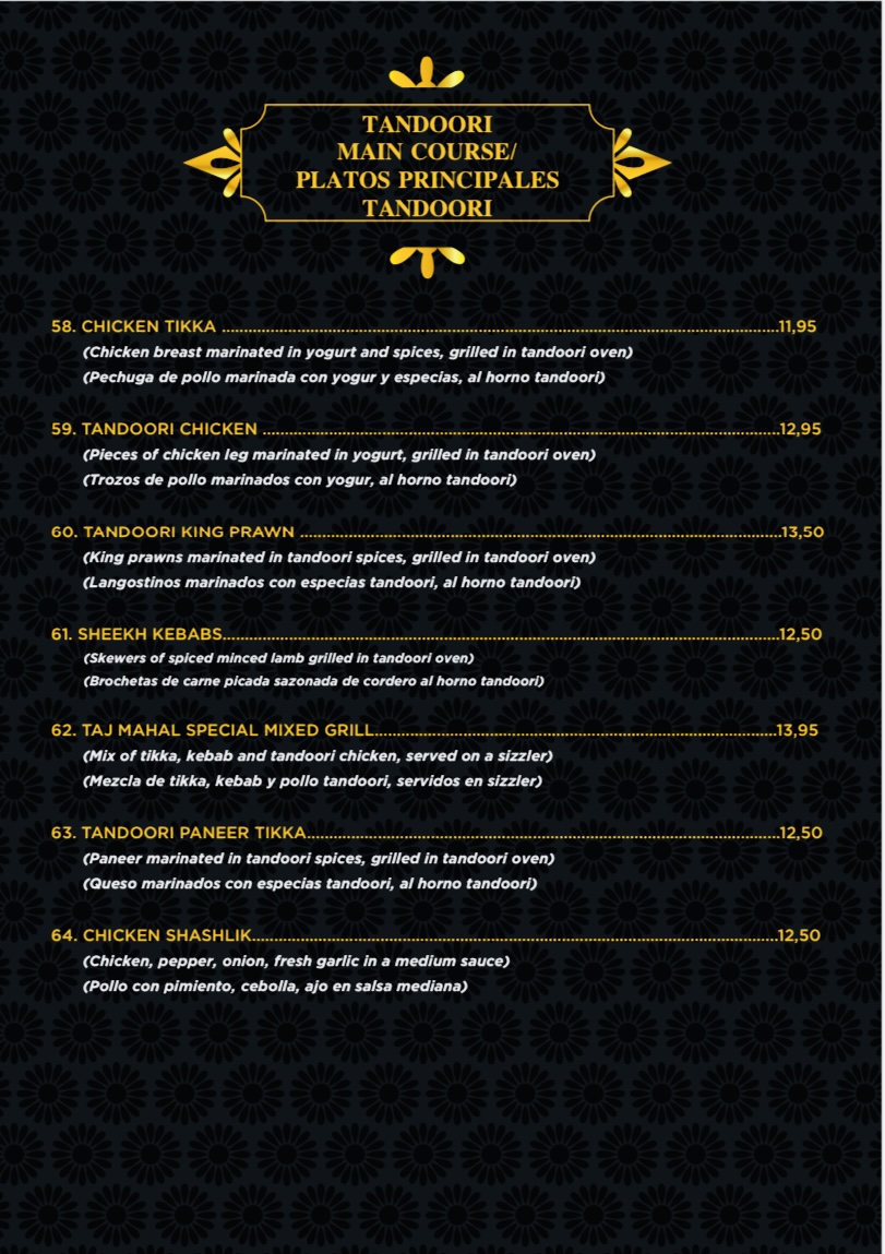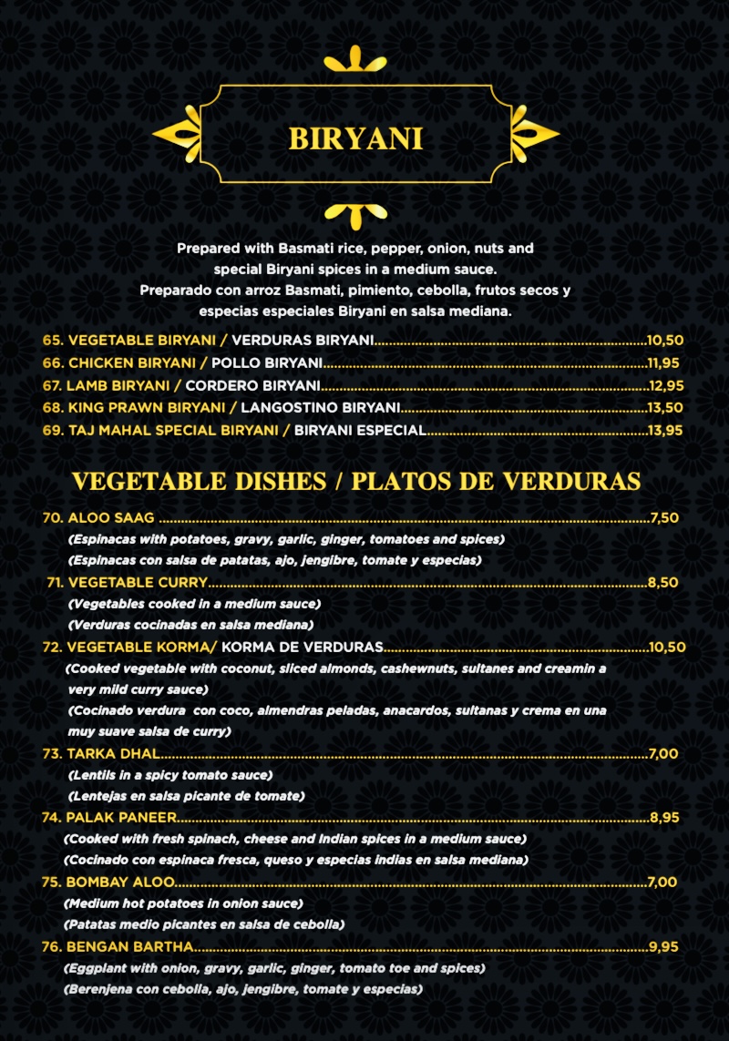 Taj Mahal indian Restaurant pinoso Menu