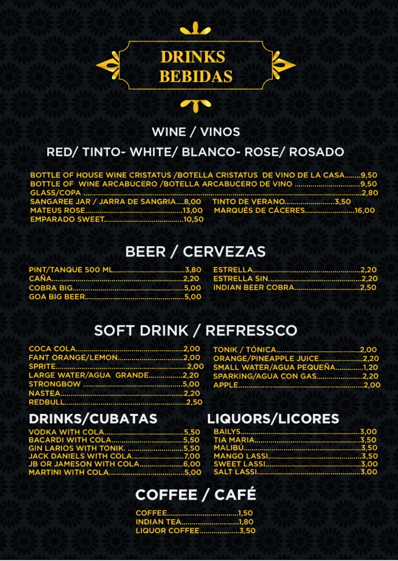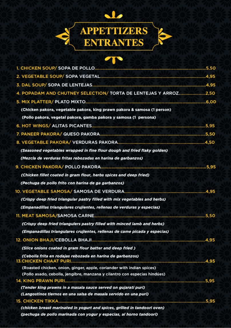The menu at Taj Mahal Indian Restaurant in Pinoso offers a straightforward and approachable selection of familiar Indian dishes, perfect for relaxed meals that feel both satisfying and comforting. It’s the kind of place where you can enjoy a leisurely lunch or a casual evening meal, savoring rich flavors without fuss.